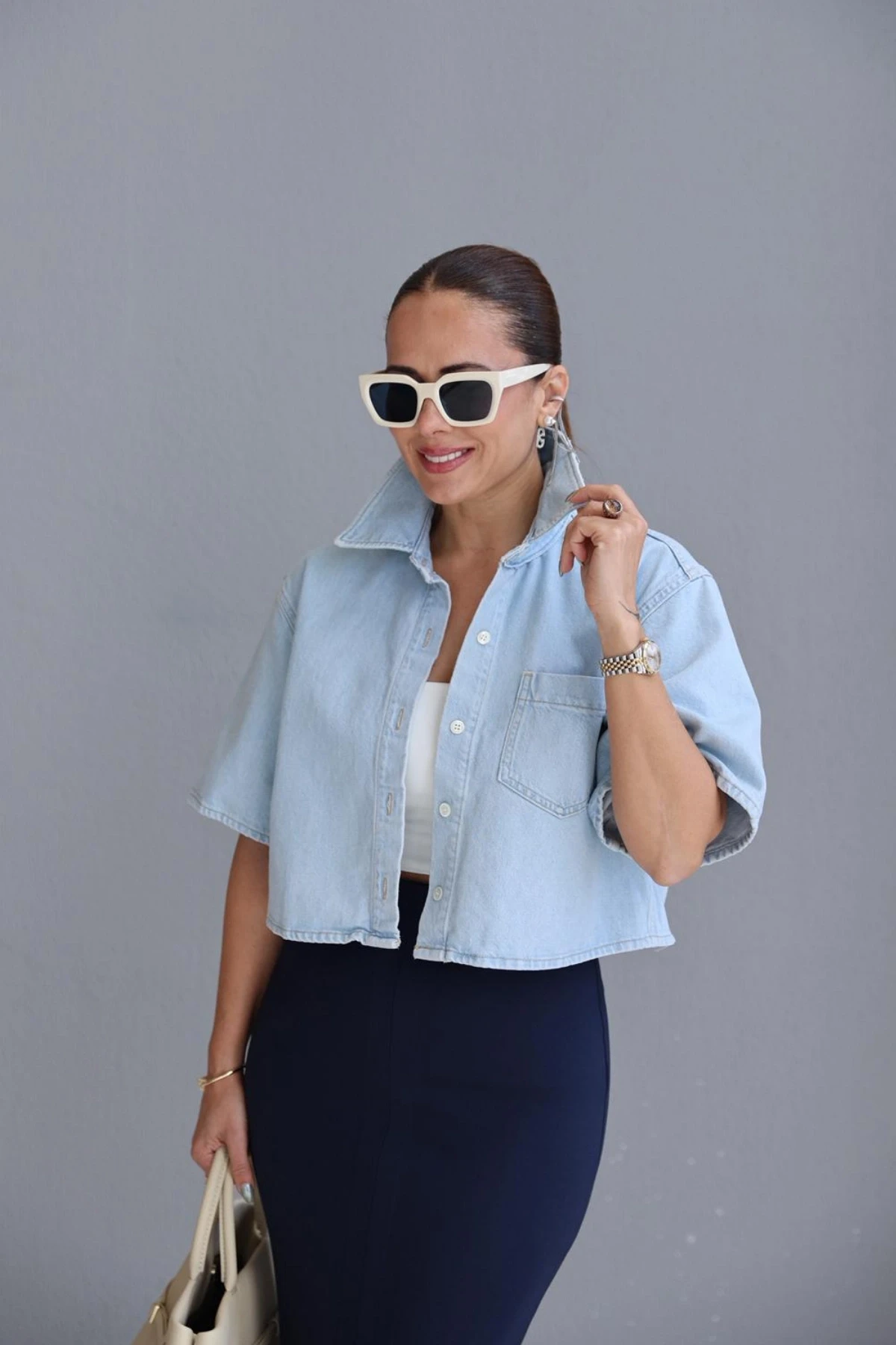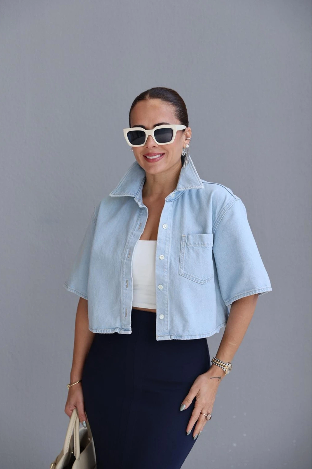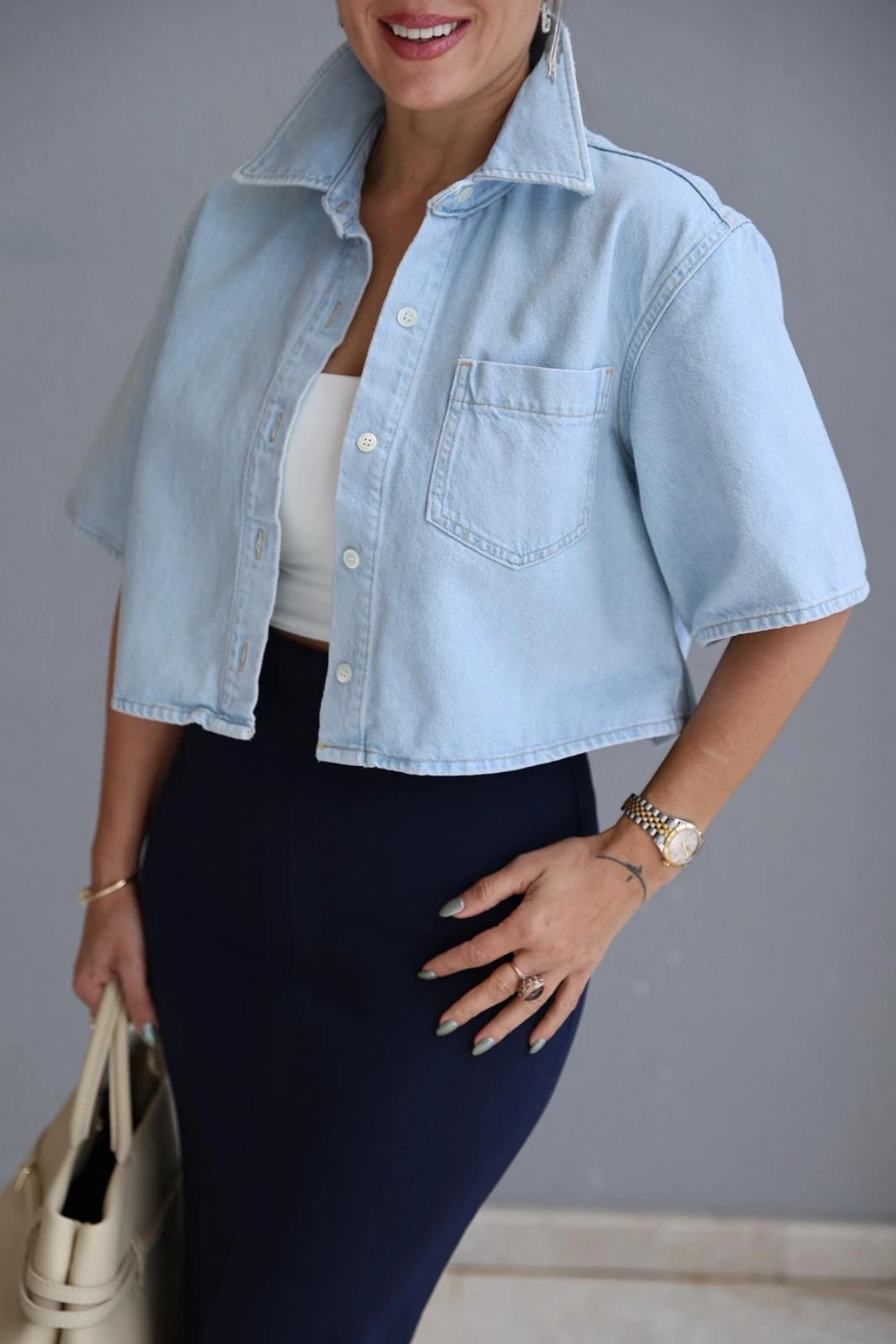 Buz Mavi Jean Crop Gömlek Hakkında
