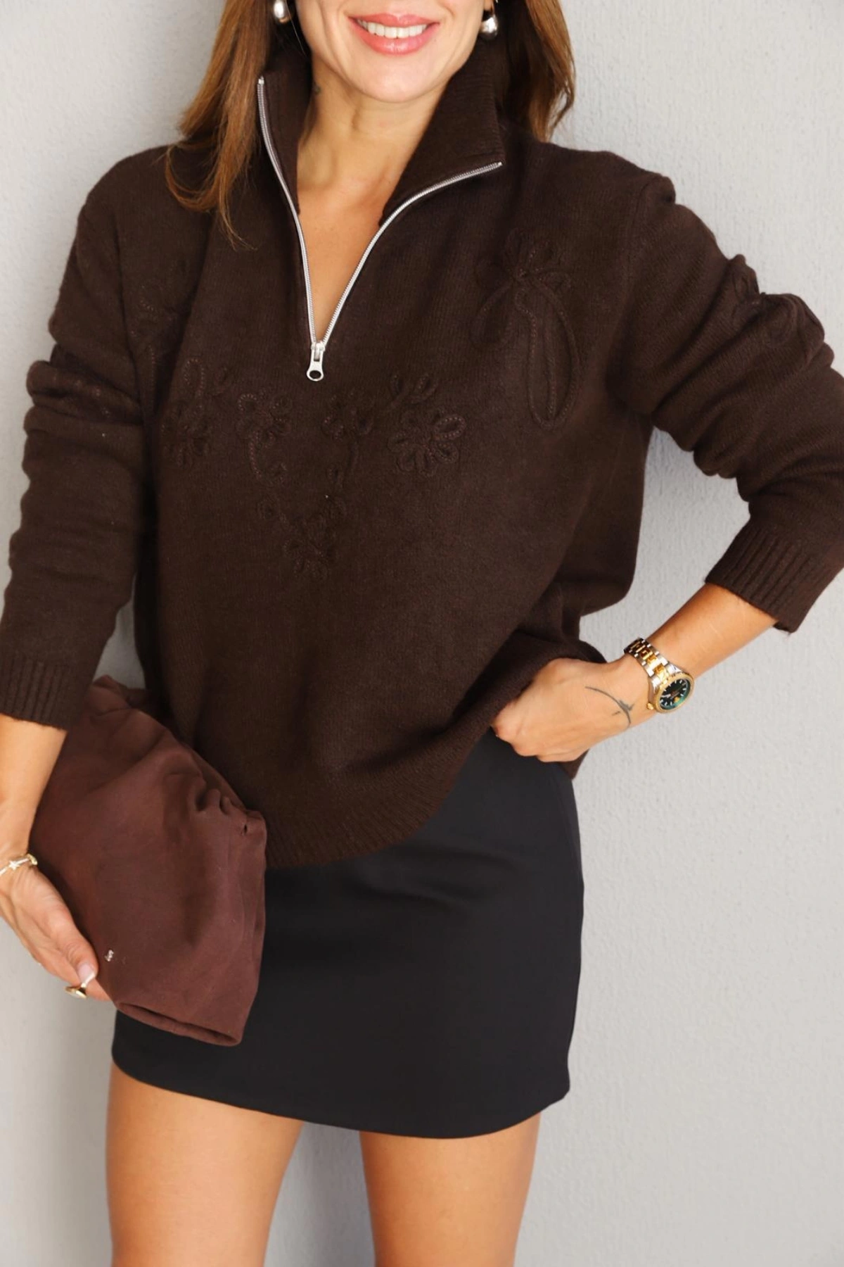 KAHVE Çiçek İşleme Detay Kazak