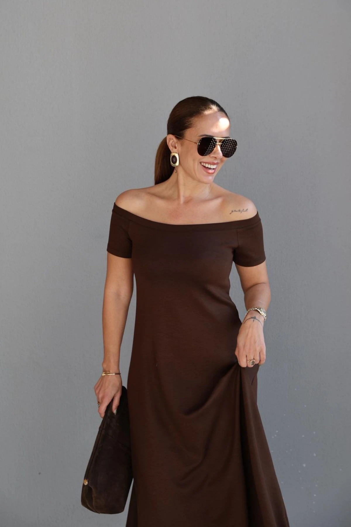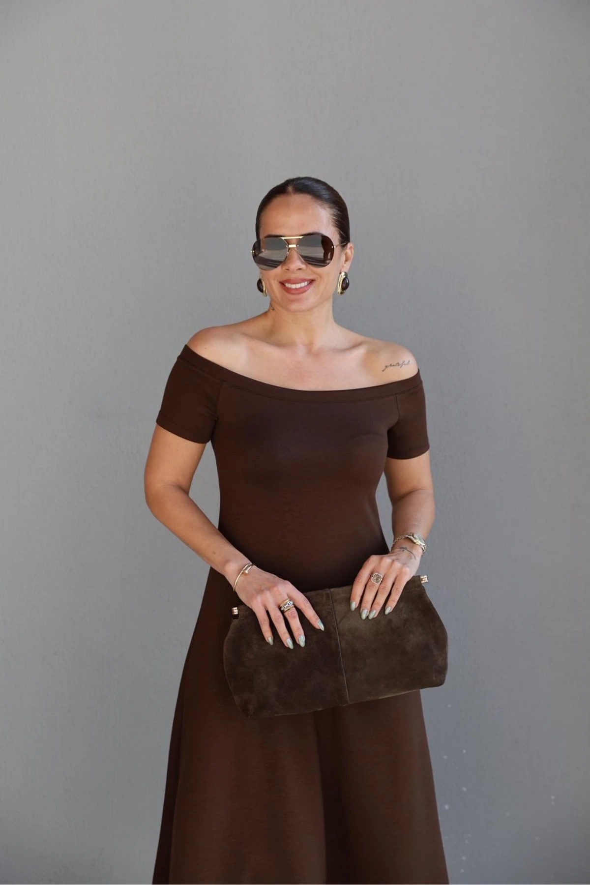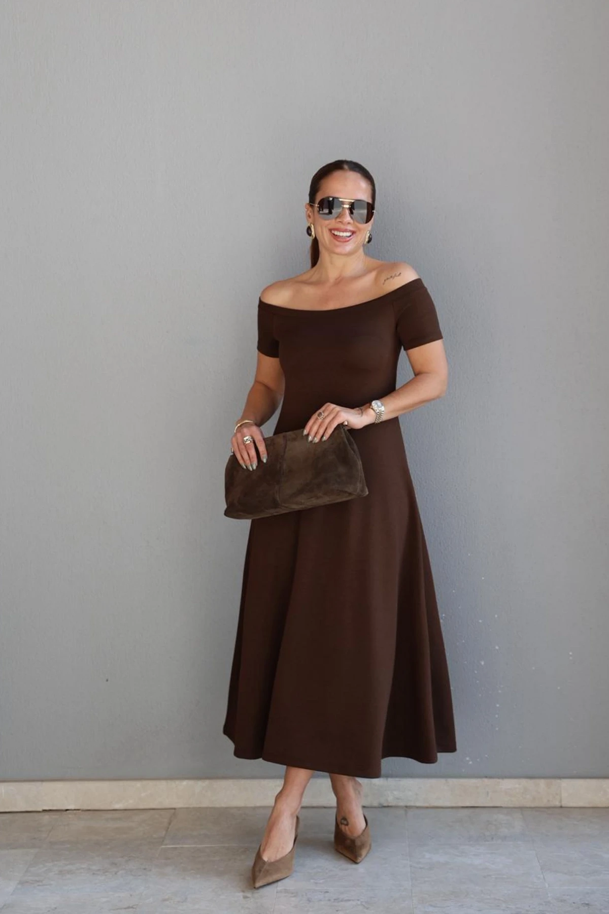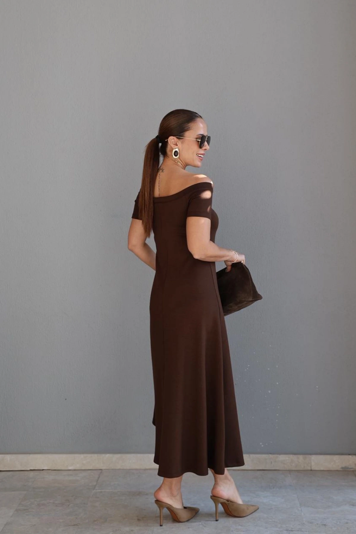 Kahverengi Kayık Yaka Maxi Elbise Hakkında
